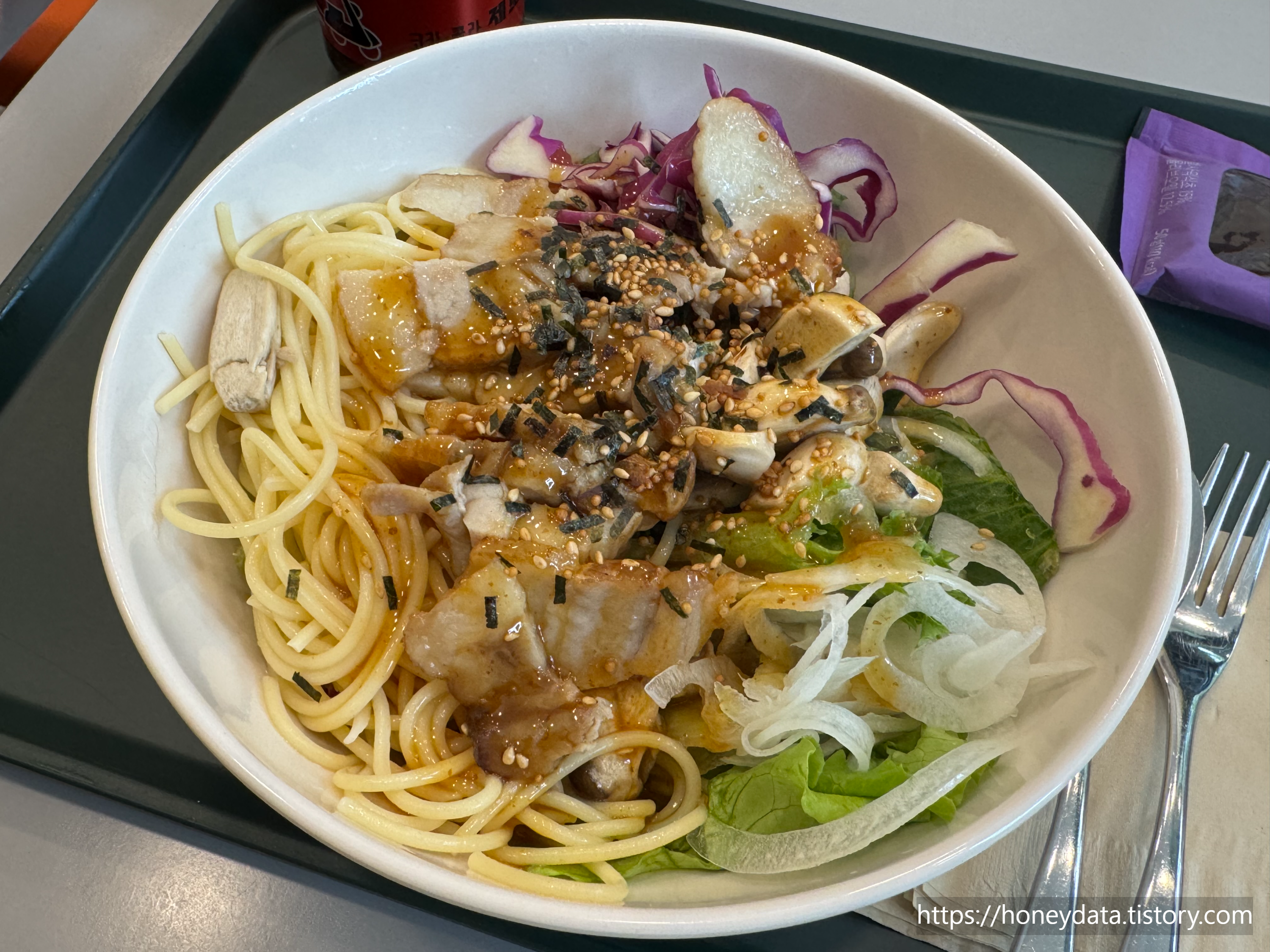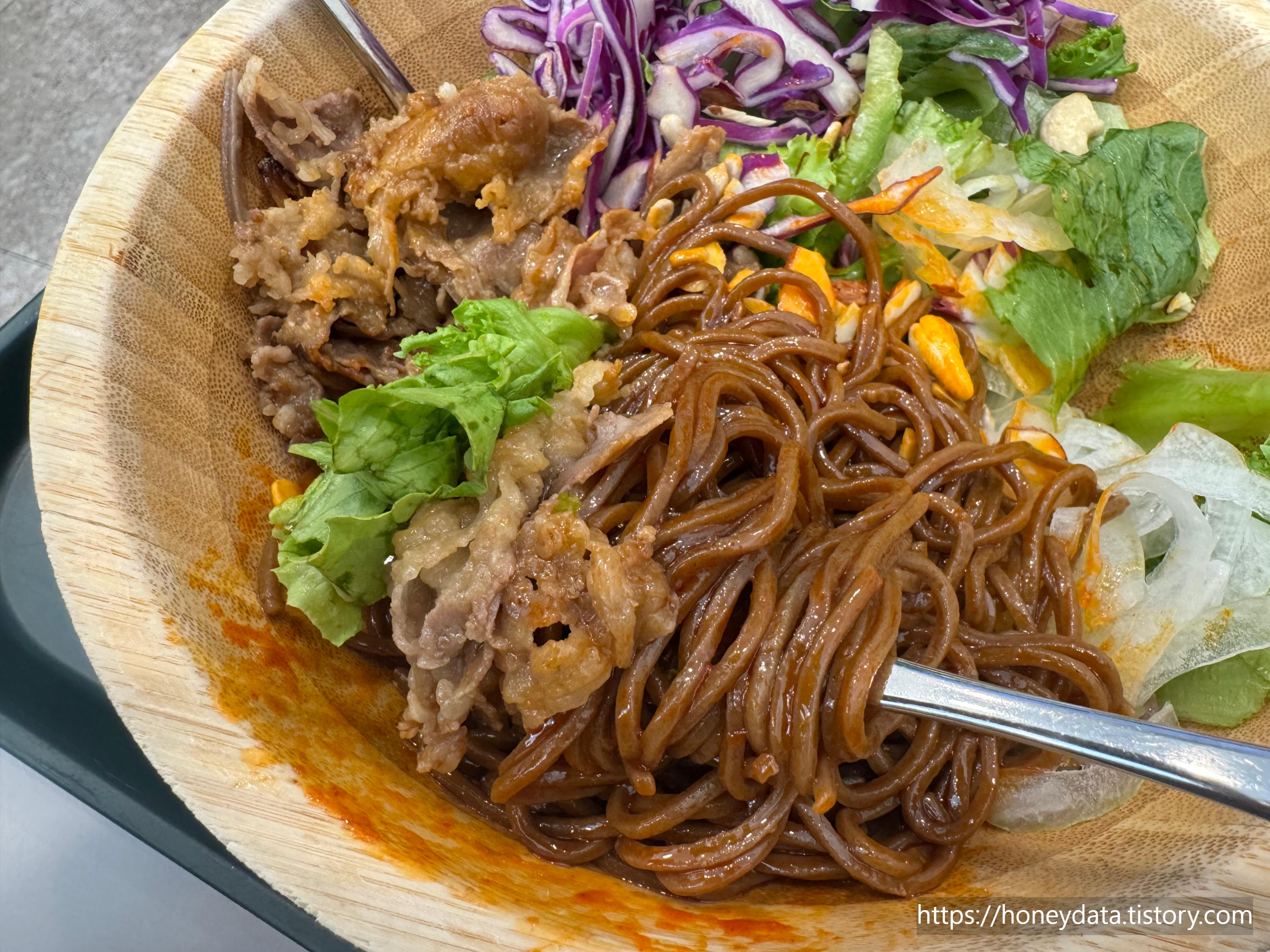 메밀면이 들어있어서 위에 메뉴보다 칼로리도 많이 높지 않아요(칼로리 406.6kcal)